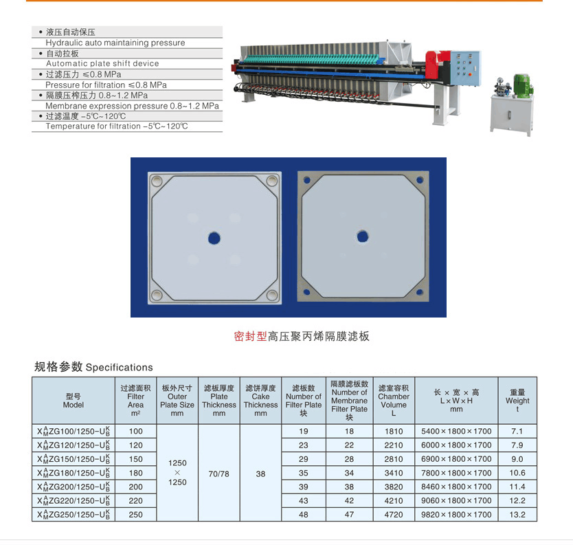1、采用聚丙烯隔膜技术,寿命长,稳定性好,通用性好,适用于多种行业。采用水压或气压压榨,压力可达到0.8-2.0mpa。